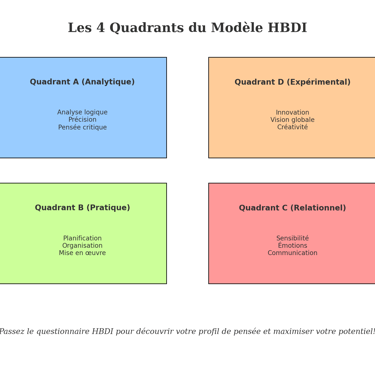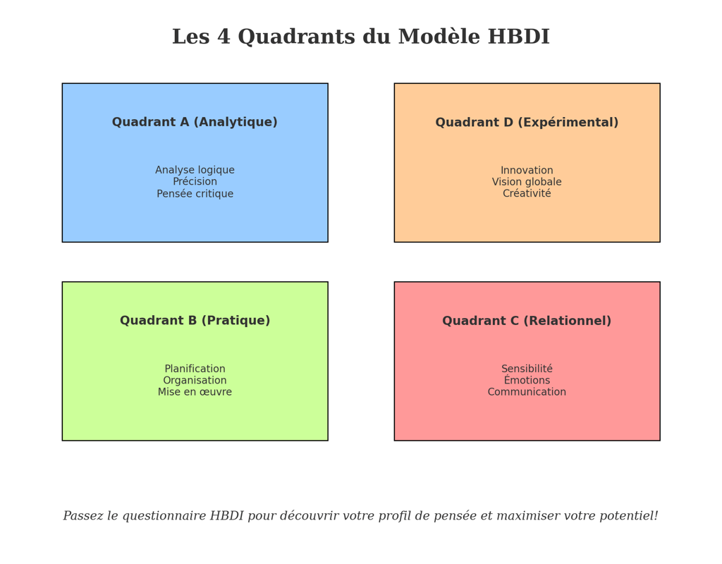 Le HBDI est un questionnaire conçu pour identifier votre style de pensée dominant. Basé sur les recherches de Ned Herrmann, ce modèle divise le cerveau en quatre quadrants, chacun représentant un style de pensée distinct :